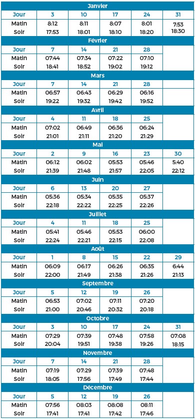 Le calendrier ci-dessous vous indique les horaires de début et de fin de pêche pour chaque samedi. Ce tableau tient compte de la réglementation autorisant la pêche 30 mn avant le lever et 30 mn après le coucher du soleil, ainsi que les changements d’horaires saisonniers.
